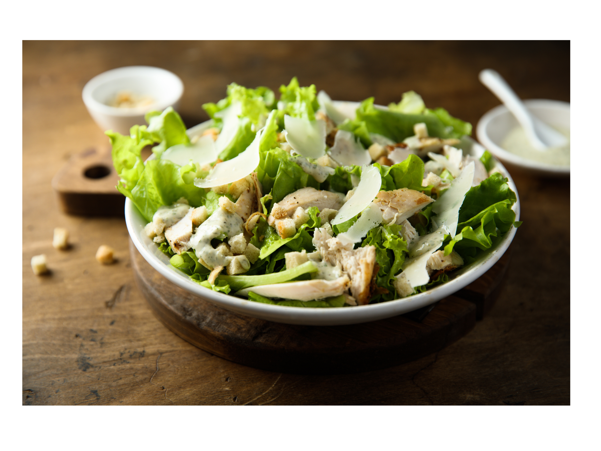 Roast Chicken, Shaved Parmesan, Crispy Bacon, Romaine Lettuce & Croutons and classic Caesar Dressing